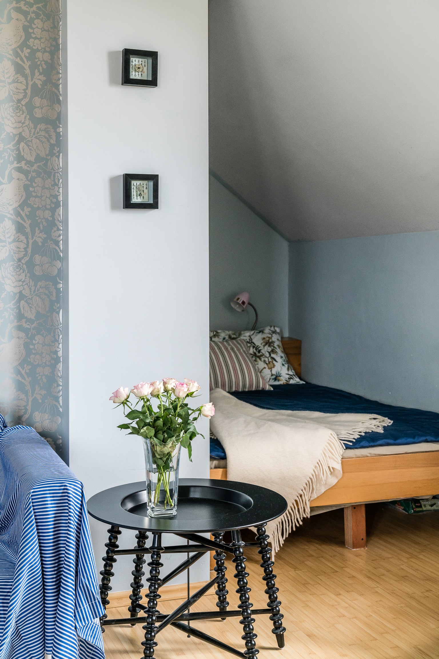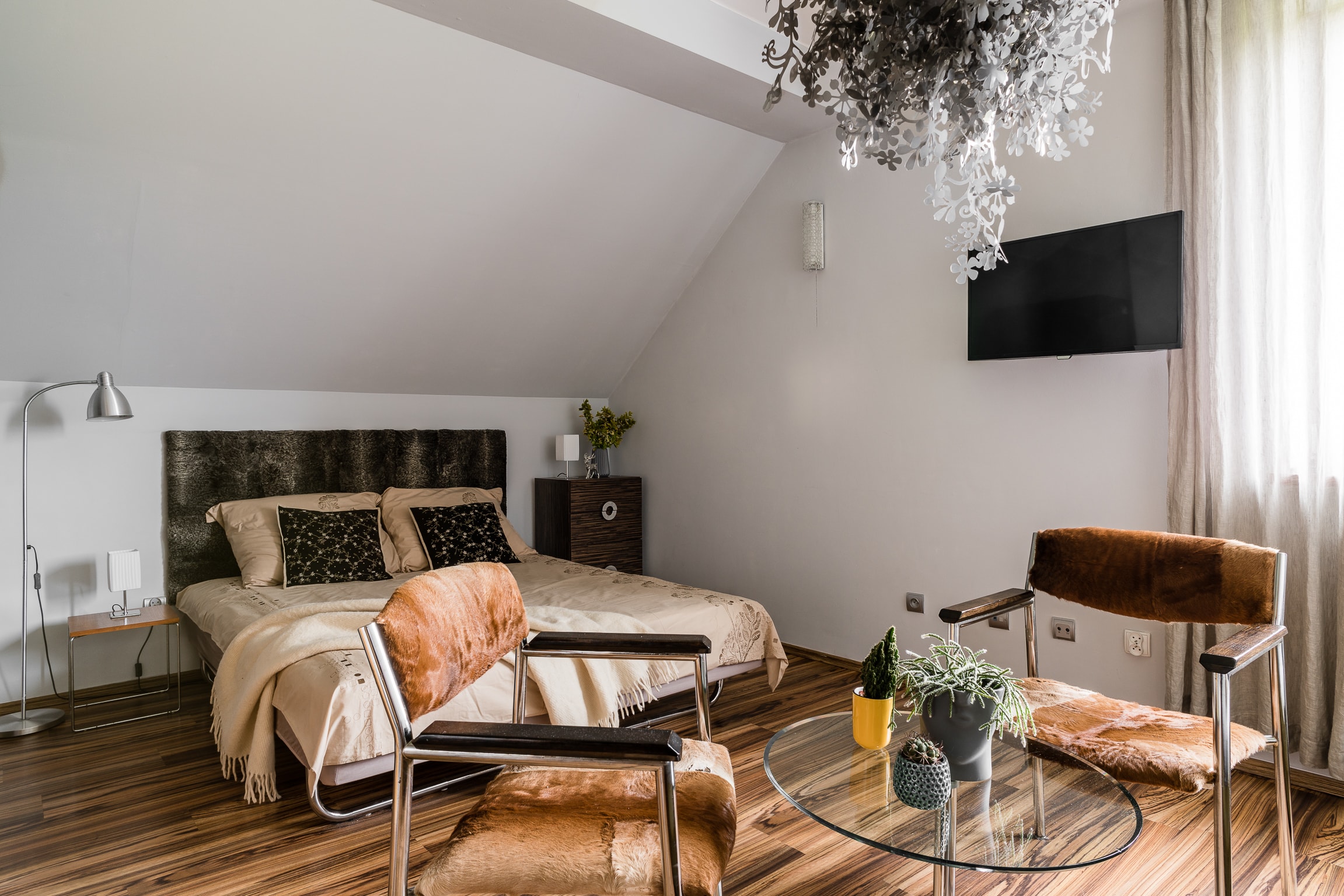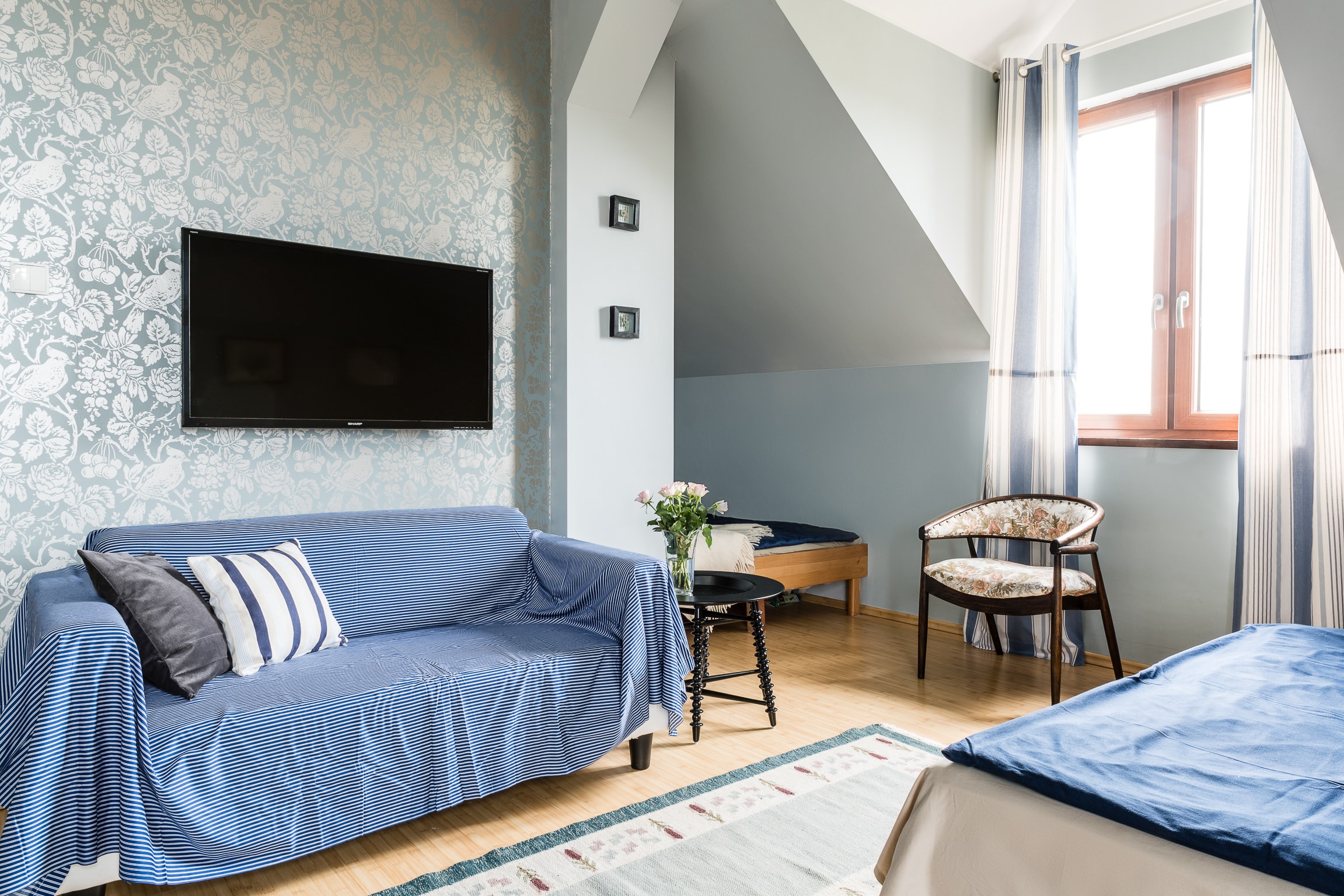 Propozycja w stylu umiarkowanie nowoczesnym. Stonowany wystrój w szarościach. Wygodne łóżko małżeńskie z dużym zagłówkiem obitym naturalnym ciemnoszarym futrem. Na wyposażeniu dodatkowo rozkładana kanapa dzięki czemu w pokoju mogą przenocować nawet cztery osoby. Przy pokoju łazienka z kabiną prysznicową. Z okna rozpościera się piękny widok na las i ogród od strony południowej.