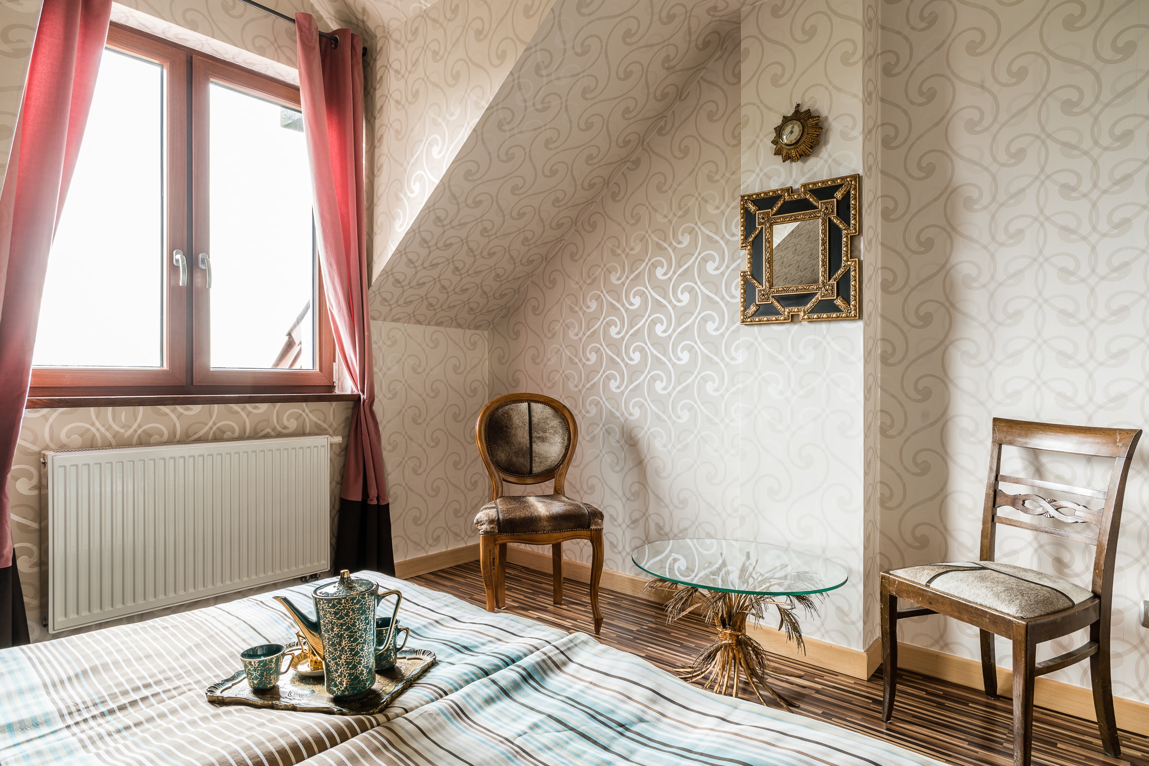 To kolejna propozycja pokoju dla dwóch osób. Klasyczny elegancki wystrój w połączeniu ze szlachetnymi tkaninami i stonowanymi kolorami jest propozycją dla gości lubiących klasykę wystroju wnętrz. Na wyposażeniu pokoju jest łóżko małżeńskie o wygodnym, miękkim materacu i zagłówkiem z naturalnego futra. W przedpokoju bardzo obszerna szafa trzydrzwiowa, do pokoju przylega łazienka z kabiną prysznicową. Pokój bardzo słoneczny- okna pokoju wychodzą na zachód, widok na ogród i pola.