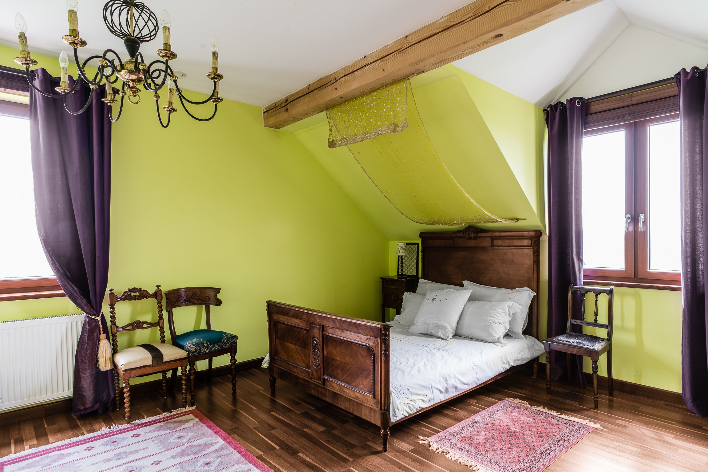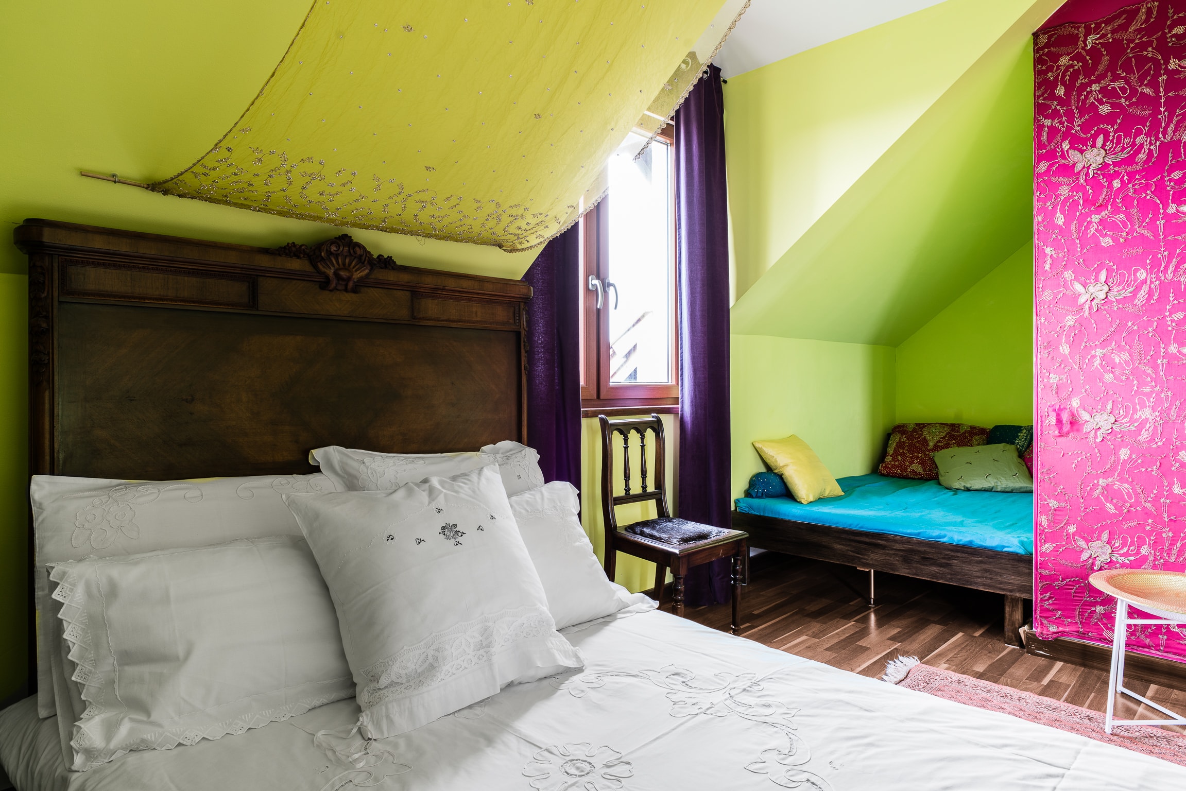 To jeden z najpiękniejszych pokoi MOLMARE, często rezerwowany przez naszych gości. Soczyste żywe kolory, wspaniale dodatki i umeblowanie stwarzają niepowtarzalny klimat orientu. Na wyposażeniu pokoju znajduje się oryginalne łóżko francuskie z XIX wieku, z bogato haftowanym baldachimem, jedno łóżko pojedyncze oraz wnękowe łóżko uwielbiane przez dzieci. W przedpokoju jest wygodna trzydrzwiowa szafa, która pomieści bagaże całej czteroosobowej rodziny. Do pokoju przylega wygodna łazienka z kabiną prysznicową. Pokój bardzo słoneczny – okna wychodzą na południe oraz na zachód. Z okien rozciąga się piękny widok na ogród, pola i las. Ze względu na niepowtarzalny charakter pokój orientalny jest często rezerwowany przez nowożeńców oraz pary na romantyczne weekendy. W pokoju orientalnym mogą nocować cztery osoby.